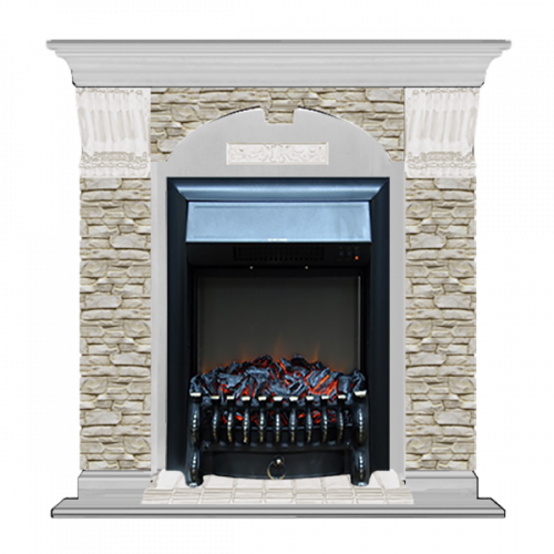 Каминокомплект Glenrich Арочный Грот однотонный (беленый дуб)+Fobos Black