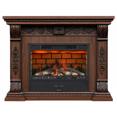 Выполнен портал каминокомплекта в классическом стиле и богато украшен декоративной резьбой. Боковые поверхности портала вокруг очага украшены прямоугольными колоннами, центральная поверхность которых украшена резными вставками. Верхняя и нижняя часть колонн оформлена волнообразными резными капителями. Подобный растительный узор украшает и центральную панель, расположенную над очагом. Сверху изделие оформлено каминной крышкой с резной отделкой по кромке. Устанавливается вся конструкция на невысокую основу, по кромке которой протянут резной рисунок.