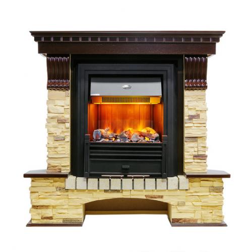 В дизайне портала использованы элементы классического стиля кантри. Это прослеживается в четком разделении зоны очага и основания. Топку обрамляют каменные панели, сверху оформленные резными консолями. На них опирается массивная каминная крышка, украшенная по периметру декоративным фризом. Высокое основание имеет арочную конструкцию, под сводом которой сформирована своеобразная ниша. Для большей реалистичности ее можно оформить искусственными или натуральными Муляж дровми. Предтопочное пространство облицовано камнем, а по бокам основание оборудовано небольшими полочками. Полочки и каминную крышку при желании можно украсить различными декоративными элементами.Очаг имеет классическую конструкцию, но благодаря оформлению выглядит технологично и современно. Его рамка окрашена в глубокий черный цвет, который подчеркнут оформлением внутренних стенок под металл. В нижнюю выступающую часть встроен механизм формирования пламени, закрытый сверху муляжом дров и углей. В муляже нет независимой светодиодной подсветки, но при работе очага создается эффект тления, придающий изделию более высокую реалистичность. В верхней части сформирована имитация вытяжки, в которую встроен обогреватель и панель управления.